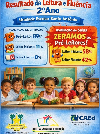 A Prefeitura Municipal de Santo Antônio dos Milagres, por meio da Secretaria Municipal de Educação, destaca os resultados alcançados pela Unidade Escolar Santo Antônio no processo de alfabetização dos alunos do 2º ano do Ensino Fundamental, evidenciando avanços significativos na aprendizagem.