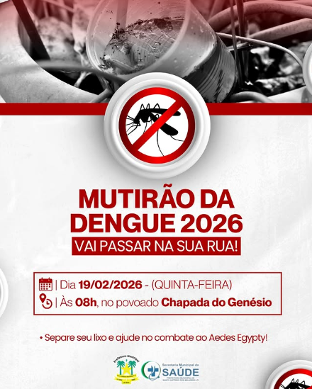 A Secretaria Municipal de Saúde de Santo Antônio dos Milagres realizará o Mutirão da Dengue 2026, que acontecerá nesta quinta-feira, 19 de fevereiro, a partir das 8h, na localidade Chapada do Genésio.
