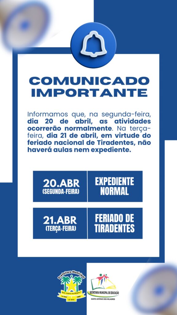A Prefeitura Municipal de Santo Antônio dos Milagres, por meio da Secretaria Municipal de Educação, informa à população o cronograma de funcionamento das atividades administrativas e escolares nos próximos dias, em virtude do feriado nacional de Tiradentes.