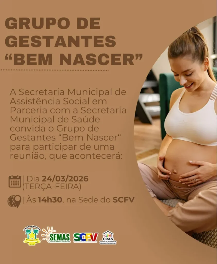 A Prefeitura Municipal de Santo Antônio dos Milagres, por meio da Secretaria Municipal de Assistência Social (SEMAS), em parceria com a Secretaria Municipal de Saúde, realizará, no dia 24 de março de 2026, reunião com as integrantes do Grupo de Gestantes “Bem Nascer”, promovendo um momento de orientação, acolhimento e cuidado.