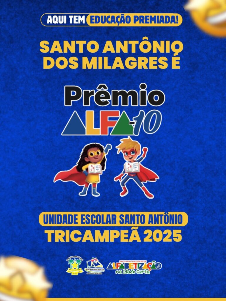 A Prefeitura Municipal de Santo Antônio dos Milagres, por intermédio da Secretaria Municipal de Educação (SEMED), informa à população que a Unidade Escolar Santo Antônio alcançou mais uma importante conquista na área educacional: o tricampeonato no Prêmio Alfa-10 2025. A premiação reconhece as escolas com os melhores indicadores de alfabetização e aprendizagem no âmbito estadual, consolidando o compromisso do município com a qualidade do ensino.
