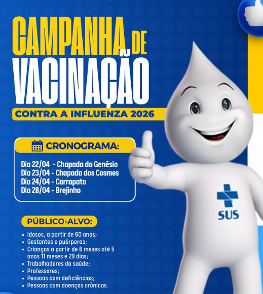 A Prefeitura Municipal de Santo Antônio dos Milagres, por intermédio da Secretaria Municipal de Saúde, informa à população o cronograma da Campanha de Vacinação contra a Influenza 2026, que segue em execução com o objetivo de ampliar a cobertura vacinal e proteger os grupos prioritários contra as complicações da gripe. A vacina é segura, gratuita e está disponível nos pontos de vacinação itinerantes conforme o calendário estabelecido.